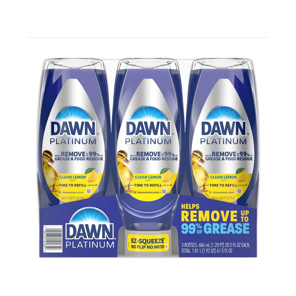 Dawn Platinum EZ Squeeze 3 x 606ml Dawn Platinum gives you a squeaky clean that you can see and feel. Dawn Platinum's improved formula helps removes up to 99% of grease and food residue. Dawn is tough on grease but gentle. Gentle enough that Dawn is the only brand of dish soap trusted by rescue workers to clean wildlife impacted by oil spills. For more than 40 years Dawn has helped save wildlife both at the sink with products designed to get dishes cleaner faster using less water and at the shore where we work with wildlife rescue experts to protect and care for aquatic wildlife. Dawn dishwashing liquid can even be used to clean items beyond the kitchen sink. Use Dawn Platinum dish soap to pre-treat greasy laundry stains, remove grease and grime from kitchen counters and appliances and to clean external car surfaces and the outer shroud of a gas grill. Made with biodegradable surfactants. Number 1 Brand in North America. The product features: Dawn Platinum helps remove up to 99% of grease and food residue With Dawn EZ-Squeeze it's easier to get the amount you want, where you want it Don't waste a drop of soap with the upside-down EZ-Squeeze bottle Save money and reduce waste by refilling your EZ-Squeeze bottle from a large bottle of Dawn Dawn Ultra's powerful formula helps you get through more dishes with less dishwashing liquid